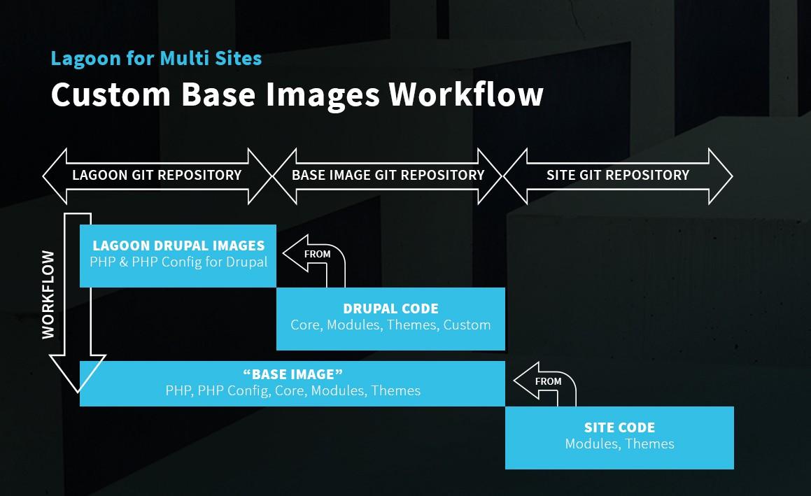 Custom Base Images allows an individual Git repository for each site along with centralized and shared core, modules, and themes in the Custom Base Image. Each site can add their own modules and themes.