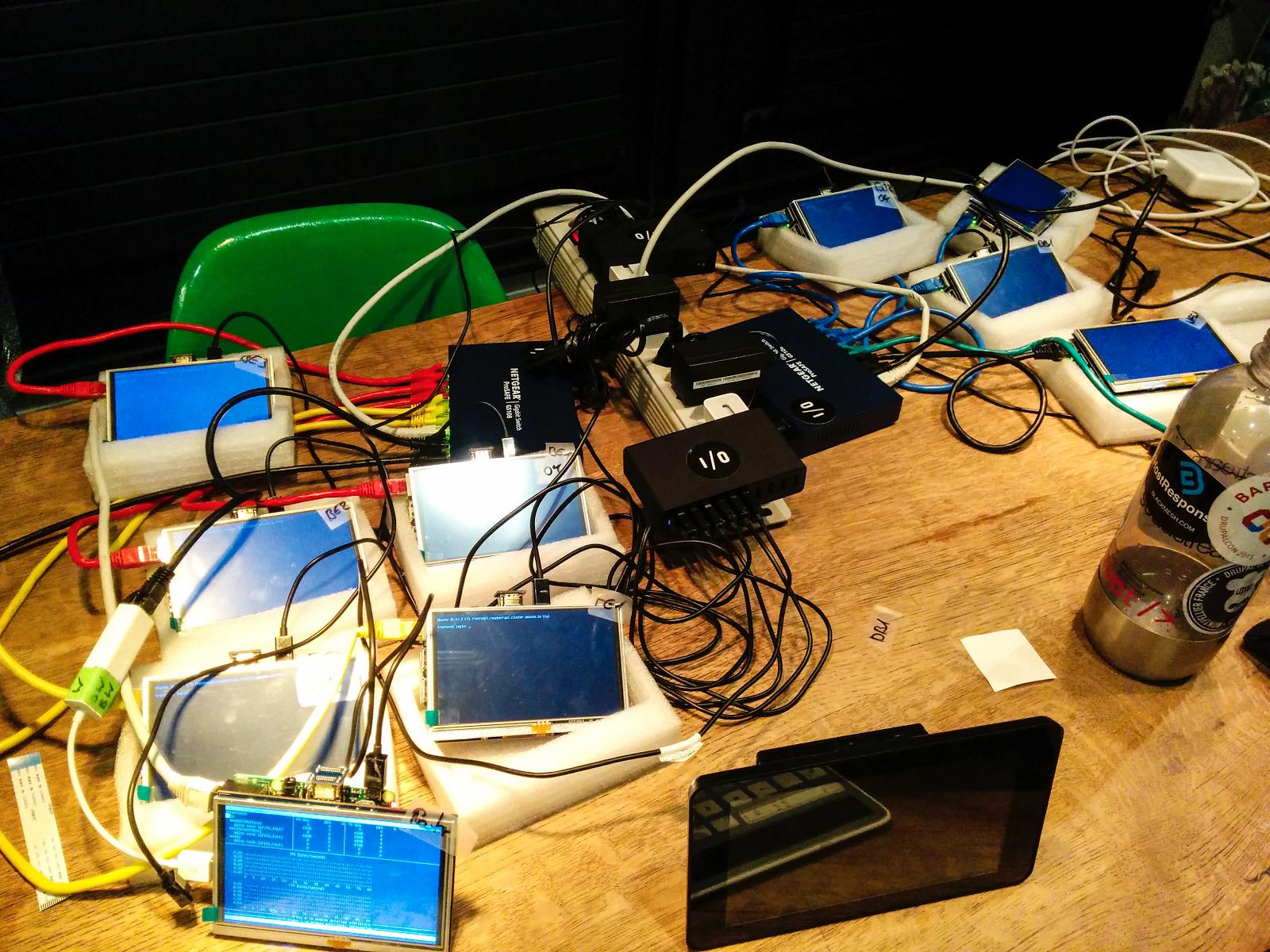 We demoed the Raspberry Pi cluster for the first time at Drupal Mountain Camp, then again at DrupalCon Baltimore to much delight. People love the blinking lights and seem to have a lot of fun pulling out and re-inserting cables, watching the failover in action.